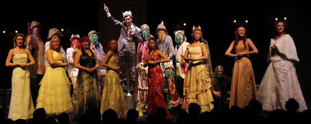 «Живая власть для черни ненавистна, они любить умеют только мёртвых». Эту цитату из пьесы Пушкина часто вспоминают по сей день, и Николай Коляда не проводит чёткой границы между временем прошедшим и настоящим. На сцене условно-исторические «народные» костюмы соседствуют с офисными пиджаками и бальными платьями; колокольный звон имитируют сувенирные кубки; вилы, ножи, топоры, прялки, бидоны, расписные тагильские подносы, матрёшки создают выразительный художественный образ, но не воссоздают подробности быта. «Борис Годунов» решён в манере площадного скоморошьего театра. И неожиданные интонации заставляют переосмыслить известный текст. Главная тема пьесы – «народ и власть» – отступает на второй план. В центре внимания оказывается сущность русского характера, долготерпение и всепрощение русских. Именно народ – главное действующее лицо в этом спектакле.