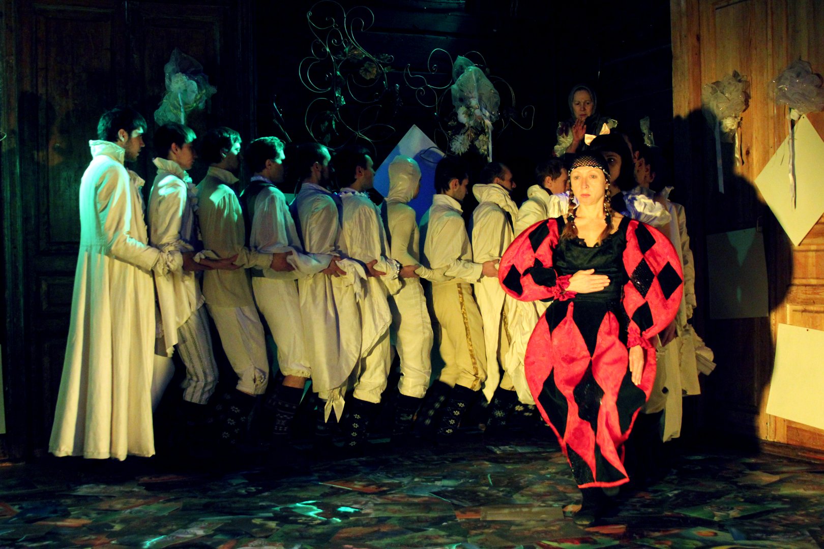 На сцене создается некий художественный мир, где костюмы, декорация, музыка — вне времени.