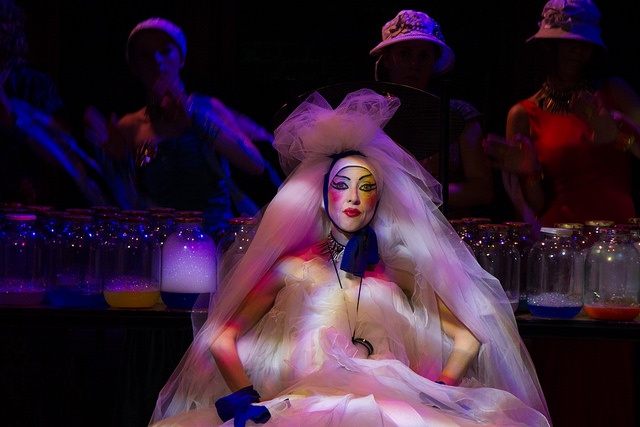 Сам текст классического произведения полностью вошёл в пьесу и практически остался неизменным. Наверное, именно так современные диджеи меняют ритм и аранжировку старых песен, добавляют повторы наиболее значимых строк. Но образные решения и неожиданные мизансцены, «добавленные» режиссёром, заставляют видеть прочтённые в школьные годы строки совсем по-другому. В этом спектакле соединены современные ритмы и старинные русские романсы. У героев весьма странные костюмы, а в декорации – не менее странные трехлитровые банки (их сто штук на сцене) с белой пеной внутри. Что в них: наркотик, сладкая вата?