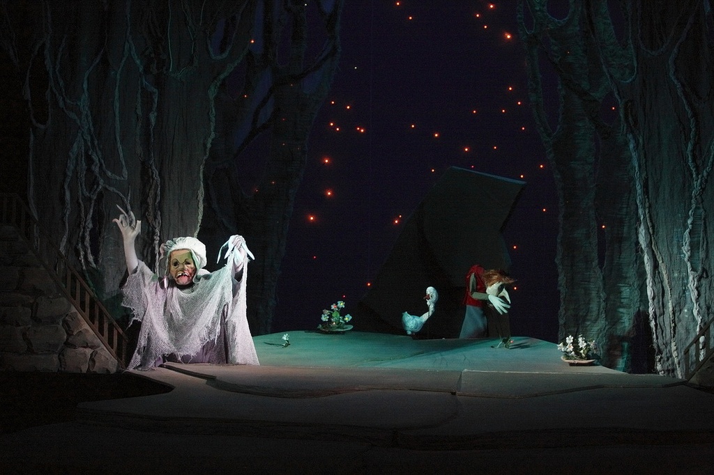 Злая колдунья превратила сына торговки в уродливого карлика и потребовала выкуп — заменить сердце мальчика на каменное. Ну, а коль не согласится — будет служить он ей вечные времена. Долгие годы мальчик искал способ вернуть себе облик, но только знакомство с Гусыней даст ему ключ к разгадке. Общий тон оформления задан художественным контекстом эпохи позднего романтизма — стилем бидермайер, его поэзией и прозой. Здесь куклы самостоятельны и независимы от людей, они обитают в своем мирке, населенном множеством вещей, дышащем жизнью и бытом. Здесь волшебство соседствует с элементарной физиологией (вспомнить хотя бы парад бутафорской снеди, проносимой к столу герцога-обжоры).