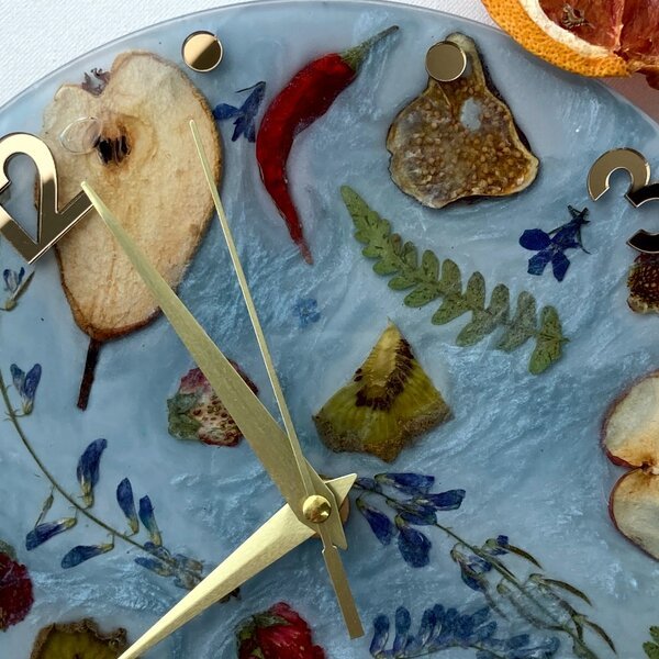 На мастер-классе вы овладеете навыками работы с эпоксидной смолой и дополните свой интерьер авторским изделием — настоящими часами! На ваш выбор десятки видов сухоцветов, а также, наша новинка — всевозможные фрукты, ягоды и другие «дары природы» для оформления вашего шедевра! Создавайте цветочные или фруктовые часики, или соединяйте всё в один яркий микс — мы за свободу творчества!
